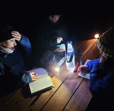 On avance, toujours dans la pénombre. À la lueur des lampes torches, les échanges vont bon train, on fait connaissance, des liens se créent autour de textes terrifiants.